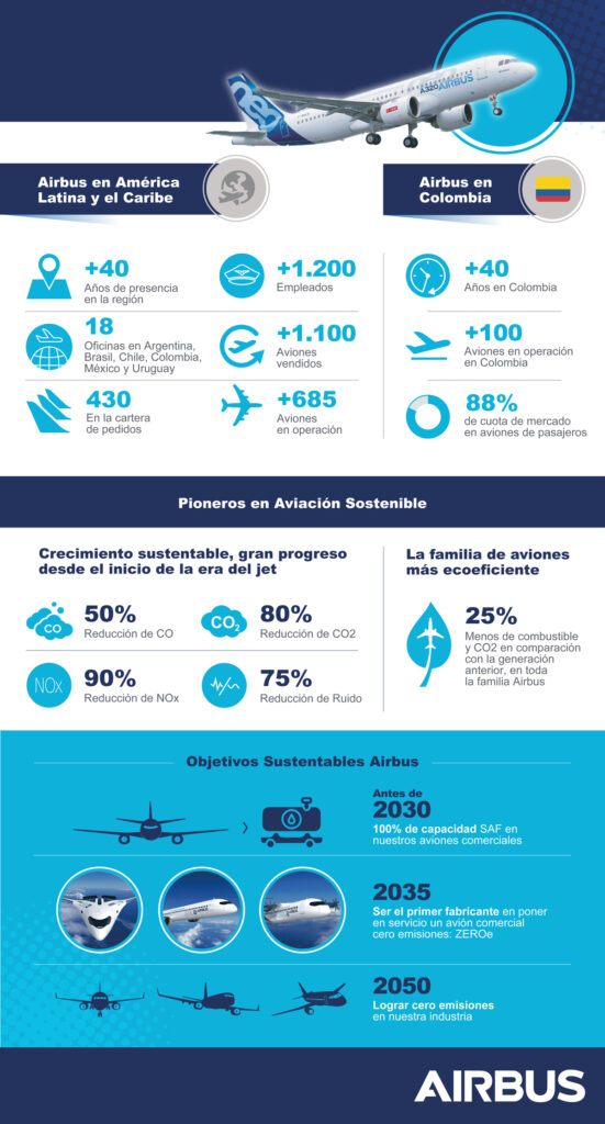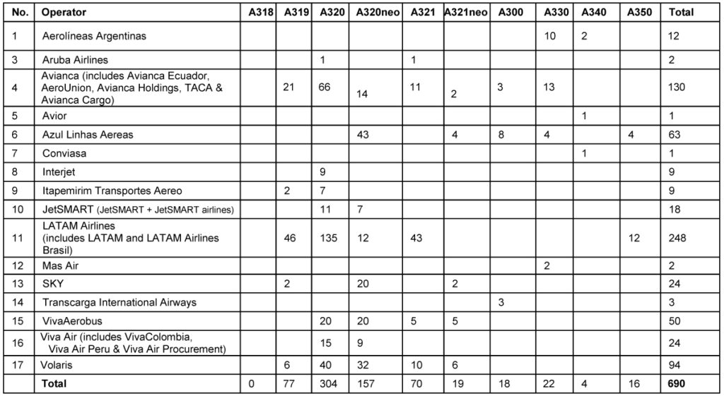Airbus ha vendido más de 1.100 aviones y tiene una cartera de pedidos de cerca de 440 y más de 690 en operación en toda América Latina y el Caribe, lo que representa casi el 60% de la cuota de mercado de la flota en servicio. Desde 1994, Airbus ha conseguido aproximadamente el 70% de los pedidos netos en la región.