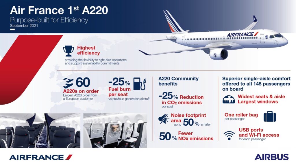 El A220 es actualmente el avión más eficiente y flexible en el segmento de mercado de 100 a 150 plazas. La renovación de la flota de pasillo único de Air France con este avión de última generación aumentará la eficiencia y el confort de los clientes, y ayudará a Air France a cumplir sus objetivos medioambientales y de sostenibilidad.