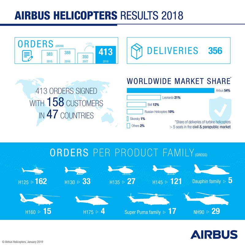 En 2018 Airbus Helicopters entregó 356 helicópteros y registró unos pedidos brutos de 413 helicópteros (netos: 381) (350 brutos en 2017), manteniendo su liderazgo en los mercados civil y parapúblicos. A su vez, reforzó su posición en el mercado militar gracias a importantes éxitos en distintas campañas internacionales. La compañía registró 148 pedidos de helicópteros ligeros bimotores de la familia H135/H145 y 15 pedidos para el helicóptero de nueva generación H160. Al final del año pasado, la cartera global de pedidos ascendía a 717 helicópteros.