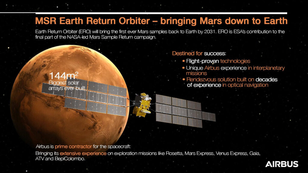 Airbus ha sido elegido por la Agencia Espacial Europea (ESA) como contratista principal del Orbitador de Retorno a la Tierra (Earth Return Orbiter, ERO) de la misión Retorno de Muestras de Marte (Mars Sample Return, MSR), el primer vehículo espacial que traerá muestras de Marte a la Tierra. El programa MSR es una campaña conjunta de la ESA y la NASA que representa un paso más en la exploración de Marte. ERO y el Róver para la Recogida de Muestras (Sample Fetch Rover, SFR) son los dos principales elementos europeos de MSR y ambos van a ser diseñados y construidos por Airbus. Un brazo manipulador llamado Brazo de Transferencia de Muestras (STA- Sample Transfer Arm) que llevará las muestras desde el SFR al vehículo de ascenso (MAV- Mars Ascent Vehicle), es la tercera contribución europea al programa MSR. El valor del contrato de ERO es 491 millones de euros.