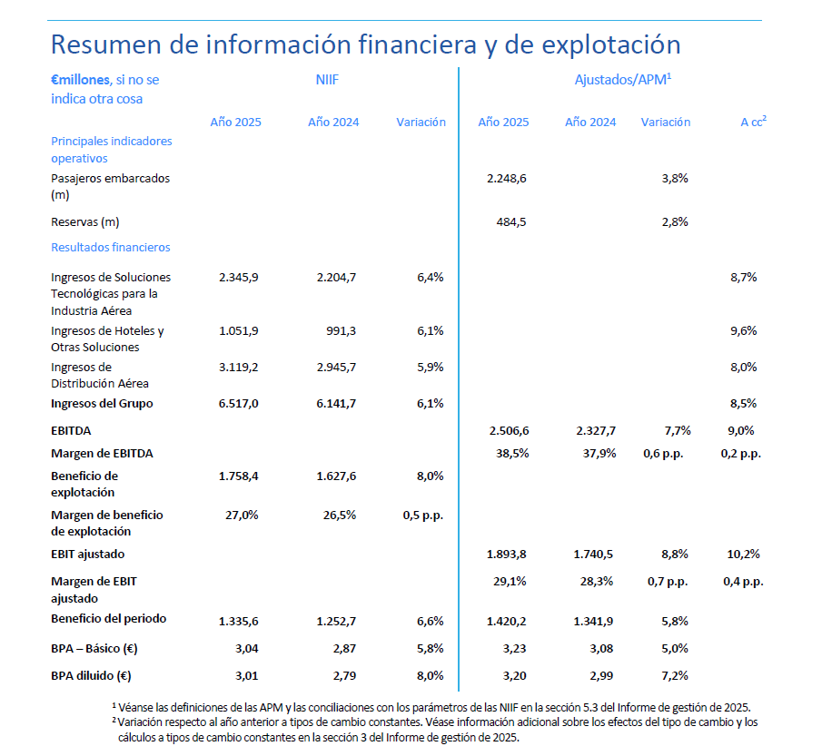 Amadeus cerró el ejercicio con solidez, acelerando tanto el crecimiento de los ingresos como de la rentabilidad. En consecuencia, los ingresos del Grupo crecieron un 6,1% en el conjunto del año, o un 8,5% a tipos de cambio constantes (un 10,0% en el cuarto trimestre), mientras que el EBIT ajustado1 aumentó un 10,2 % a tipos de cambio constantes (un 15,4% en el cuarto trimestre). En 2025, seguimos invirtiendo de forma estratégica en el futuro, destinando más de 1.400 millones de euros a I+D, importe que representa más del 20% de los ingresos del Grupo. En el ejercicio generamos un flujo de efectivo disponible1 de 1.302,2 millones de euros, un 6,9% más que en 2024 (excluidas las entradas de tesorería no recurrentes de 2024). Adicionalmente, completamos un programa de recompra de acciones por valor de 1.300 millones de euros en el cuarto trimestre.