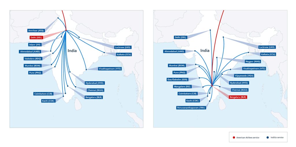 • Los clientes de American tendrán acceso a 29 nuevas rutas desde Bangalore y Delhi.
