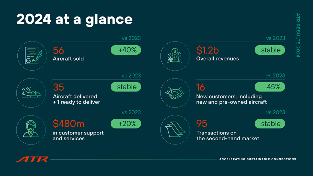 Las entregas estuvieron en línea con el nivel de 2023, con 35 aviones entregados, más uno listo para ser entregado, cumpliendo con las previsiones proporcionadas a principios de año. De cara al futuro, ATR espera que 2025 sea otro año de estabilización, ya que las tensiones en la cadena de suministro se mantendrán al menos durante la primera mitad del año.