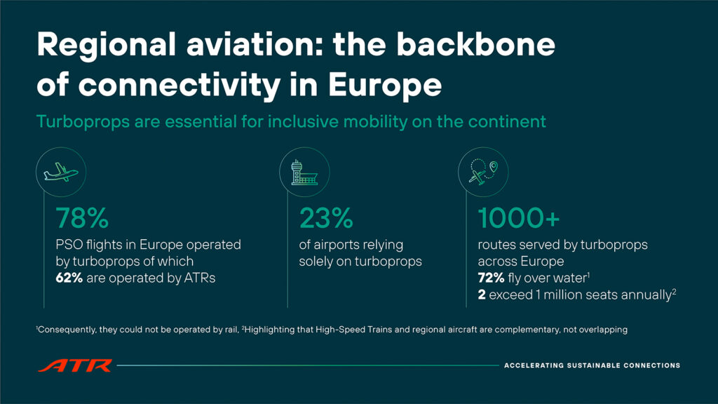 La aviación regional genera 335.000 empleos, aporta 23.100 millones de euros a la economía europea y garantiza la unidad de Europa, no solo política, sino también física. Dado que el 72% de los vuelos ATR en Europa operan sobre agua, muchas rutas son irremplazables por cualquier alternativa de transporte terrestre.