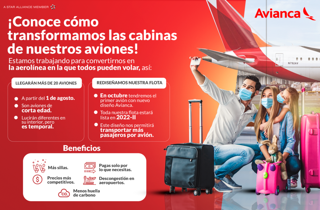 Avianca acelera la reconfiguración interior de sus aviones, la cual tiene como propósito mantener la diferenciación del producto dependiendo de la talla adquirida, ofrecer un mayor número de sillas por avión, todas nuevas, y consolidar la oferta de Vuela a Tu Medida. Con este proyecto, se pondrán a la venta un 20% más de sillas por avión y la eficiencia que esto representa se verá reflejada de manera permanente en precios más bajos.