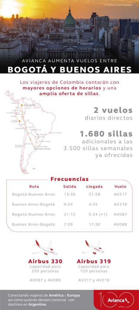 En respuesta a la alta demanda de viajeros en la ruta, desde este primero de marzo Avianca aumenta su oferta de sillas en la ruta Bogotá-Buenos Aires-Bogotá, ofreciendo un vuelo adicional diario. Así, los viajeros ahora disponen de dos vuelos diarios directos y 1.680 sillas adicionales semanales desde Bogotá, lo que representa casi un 50% de incremento en la oferta.