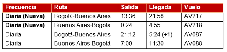 Las frecuencias AV087 y AV088 se mantienen en la operación de aviones Airbus 330 con capacidad para 252 personas; en tanto los vuelos AV217 y AV218 empezarán a ser servidos en aeronaves Airbus 319 con capacidad para 120 viajeros.