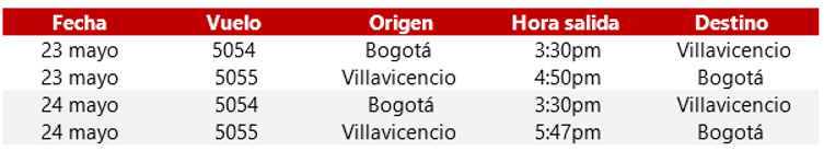 Durante el 23 y 24 de mayo se tendrán dos vuelos adicionales cada día (ida y regreso), en aviones ATR72, brindando 254 sillas más para los viajeros, lo que, junto con la operación regular de la aerolínea, permitirá contar con 762 sillas durante estos dos días.