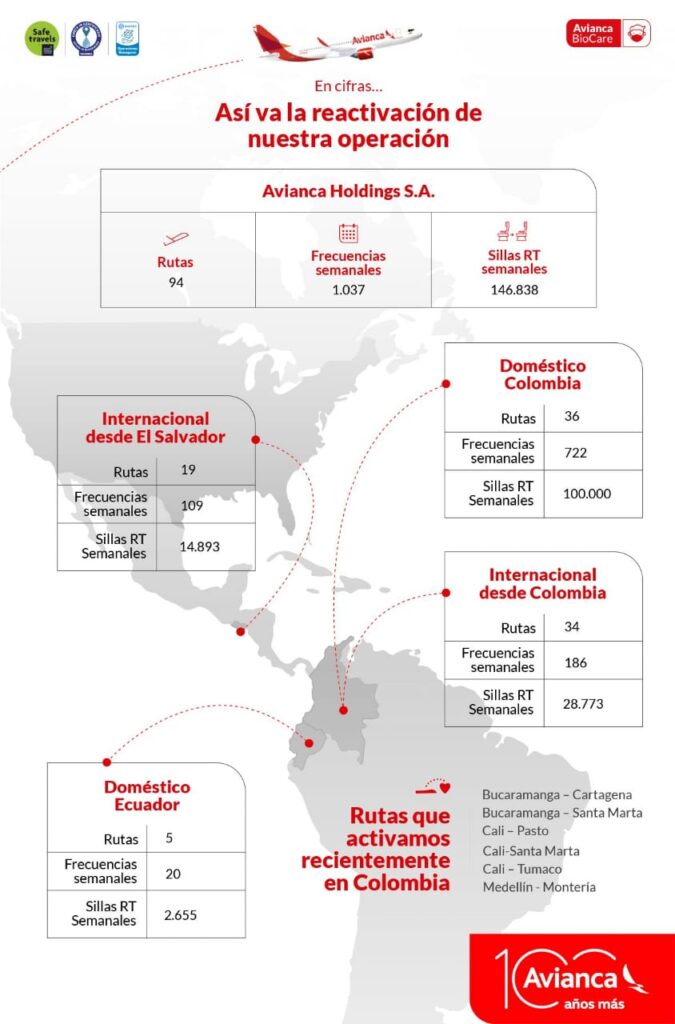 La aerolínea tiene activas 36 rutas nacionales con la disposición de más de 100 mil sillas. Las 6 rutas adicionales que reactivó desde inicio de año son vuelos que unen diferentes regiones del país sin escalas en Bogotá, lo que sin duda facilitará los planes de miles de pasajeros colombianos. Estas rutas son: