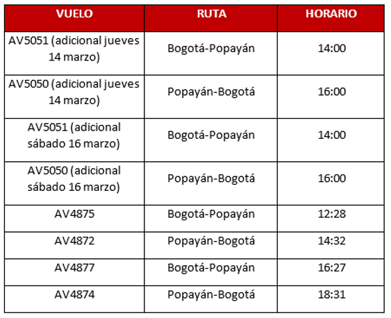 Con el fin de facilitar el desplazamiento a quienes requieren viajar al Cauca, en coordinación con las autoridades la Aerolínea dispuso recursos para operar dos vuelos adicionales: uno este jueves 14 de marzo y otro el sábado 16 en la ruta Bogotá-Popayán-Bogotá.