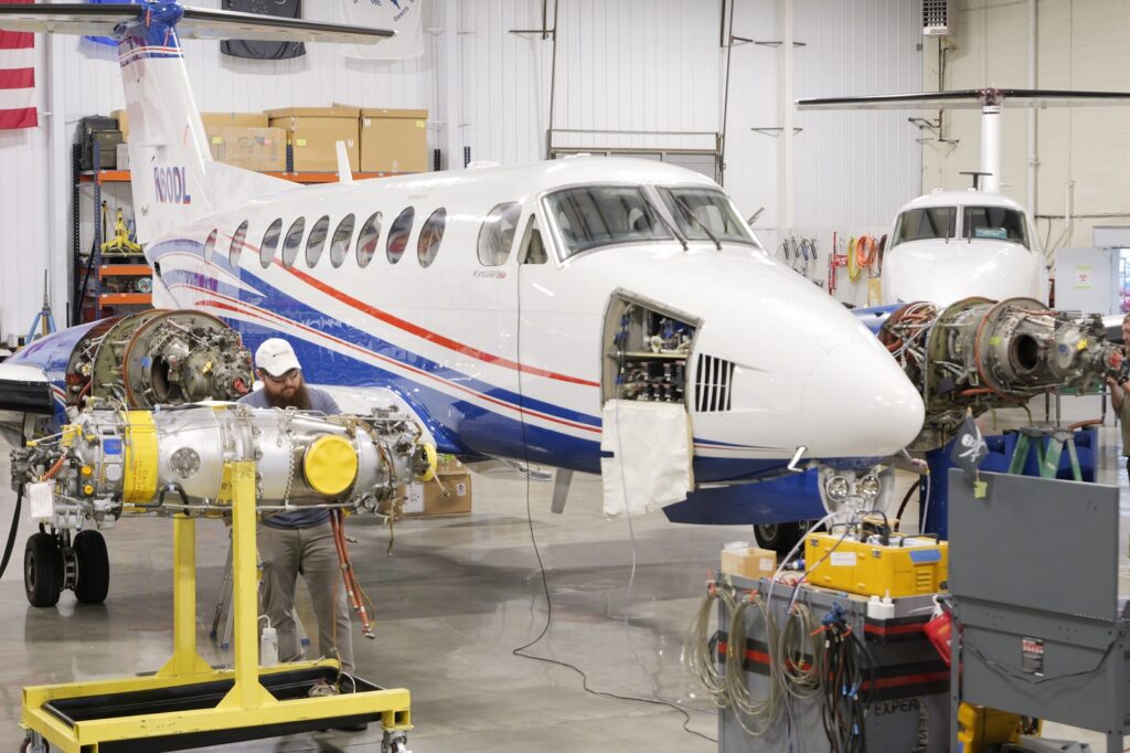 El Centro de Rendimiento de Blackhawk instala motores PT6A-67A en un King Air 350 en sus instalaciones de Columbia, MO