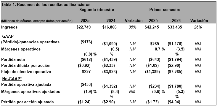 Boeing registró ingresos por USD$22.700 millones en el segundo trimestre, una pérdida por acción según GAAP de (USD$0,92) y una pérdida por acción ajustada (no GAAP) de (USD$1,24). La compañía reportó un flujo de efectivo operativo de USD$200 millones de dólares y un flujo de caja libre negativo (no GAAP) de USD$200 millones. Estos resultados reflejan principalmente una mejora en el desempeño operativo y el volumen de entregas comerciales.