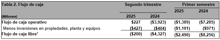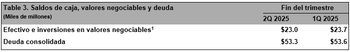 El efectivo y las inversiones en valores negociables totalizaron USD$23.000 millones, en comparación con USD$23.700 millones al inicio del trimestre, impulsado principalmente por el pago de deuda y el uso del flujo de caja libre durante el período.