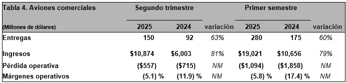 Los ingresos del segmento de Aviones Comerciales en el segundo trimestre fueron de USD$ 10.900 millones, con un margen operativo del 5,1%, reflejando principalmente un mayor volumen de entregas.