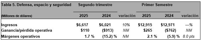 Los ingresos del segmento de Defensa, Espacio y Seguridad en el segundo trimestre fueron de USD$ 6.600 millones. El margen operativo del 1,7% refleja una estabilización en el desempeño operativo.