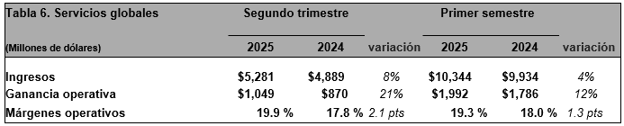 Los ingresos del segundo trimestre del segmento fueron de USD$ 5.300 millones con un margen operativo de 19,9%, reflejando buen desempeño y combinación de servicios.