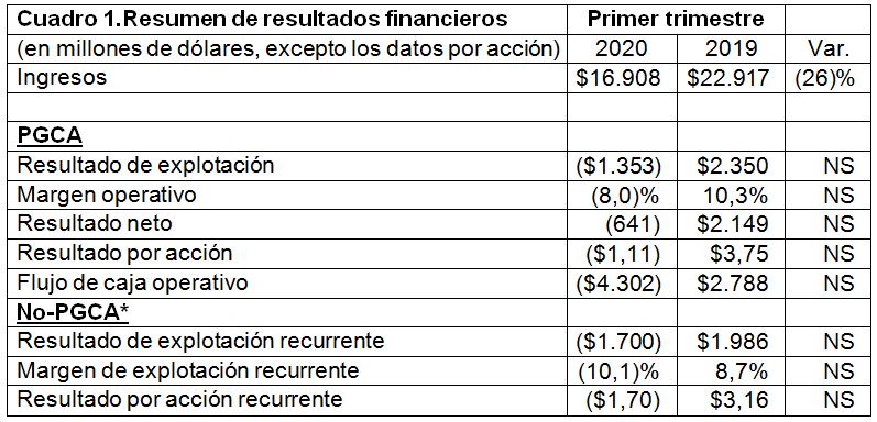 The Boeing Company ha publicado unos ingresos del primer trimestre de 16.900 millones de dólares, pérdidas por acción (según PCGA) de (1,11) dólares y pérdidas por acción recurrentes (no-PCGA)* de (1,70) dólares, lo que refleja principalmente el impacto del COVID-19 y de la suspensión temporal del 737 MAX (Cuadro 1). Boeing registró un flujo de caja operativo de (4.300) millones de dólares.