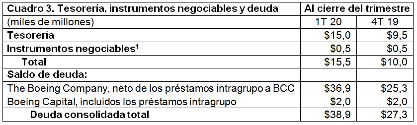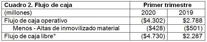 El flujo de caja operativo del trimestre, que se situó en (4.300) millones de dólares, reflejó principalmente el impacto de la suspensión temporal del 737 MAX y del COVID-19, además del calendario de cobros y pagos (Cuadro 2).