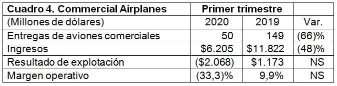 Los ingresos de la división de Commercial Airplanes en el primer trimestre se elevaron a 6.200 millones de dólares por el menor volumen de entregas a causa de la suspensión del 737 MAX y el efecto del COVID-19 (Cuadro 4). El margen operativo disminuyó a (33,3) por ciento en el primer trimestre debido al menor volumen de entregas, el registro de 797 millones de dólares de costes extraordinarios de producción por la suspensión temporal de la fabricación del 737 MAX, un cargo de 336 millones de dólares relacionado con el coste de reparación del componente de montaje del bastidor del 737 Next Generation (el llamado “tenedor de aceitunas”), la reducción de márgenes atribuible principalmente al COVID-19, y el registro de costes extraordinarios de producción por importe de 137 millones de dólares por la suspensión temporal de actividades en Puget Sound a causa del COVID-19.