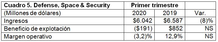La división de Defense, Space & Security registró una disminución de los ingresos hasta los 6.000 millones de dólares en el primer trimestre, principalmente por una dotación relacionada con el avión cisterna KC-46A Tanker (Cuadro 5). El margen operativo del primer trimestre disminuyó hasta el (3,2) por ciento, principalmente por una dotación por importe de 827 millones de dólares antes de impuestos relacionada con el avión cisterna KC-46A Tanker, de los que 551 millones de dólares son atribuibles a los costes asociados con el acuerdo firmado en abril con las Fuerzas Aéreas estadounidenses para el desarrollo y la integración de un nuevo Sistema de Visión Remota; los costes restantes reflejan ineficiencias de producción y la disrupción de la producción por el COVID-19. También otros programas se vieron afectados por el COVID-19, lo que mermó aún más el margen en el trimestre.