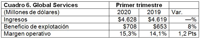 Los ingresos de Global Services en el primer trimestre ascienden a 4.600 millones de dólares, lo que refleja un mayor volumen de servicios a administraciones públicas, compensado en gran medida por un menor volumen de servicios comerciales a causa del COVID-19. (Cuadro 6). El margen operativo aumentó hasta el 15,3 por ciento en el primer trimestre, principalmente por el comportamiento favorable del segmento de servicios a administraciones públicas.