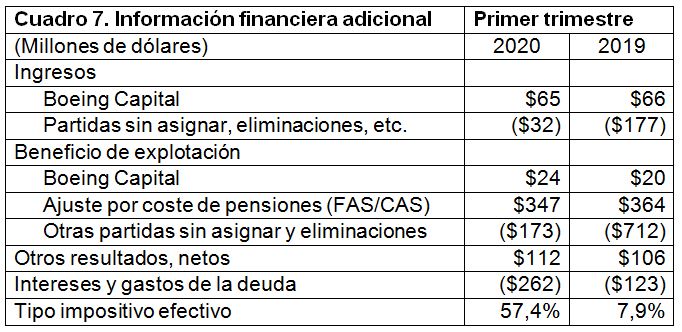 Al cierre del trimestre, la cartera neta de Boeing Capital se elevaba a 2.200 millones de dólares. Los ingresos procedentes de las otras partidas sin asignar y las eliminaciones aumentaron fundamentalmente por el calendario de eliminaciones de las ventas de aviones dentro del Grupo. El cambio de los beneficios procedentes de otras partidas sin asignar y eliminaciones se debe principalmente a un menor gasto de remuneraciones plurianuales y al registro en el primer trimestre de 2019 de un ajuste por valoración de financiación a clientes. Los gastos por intereses y relacionados con el endeudamiento aumentaron por el mayor saldo de deuda. El tipo impositivo efectivo del primer trimestre refleja un efecto fiscal positivo por la compensación retroactiva en 5 años de las pérdidas operativas bajo la ley CARES de medidas económicas especiales relacionados con el COVID-19 así como por el efecto de las pérdidas antes de impuestos.
