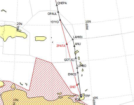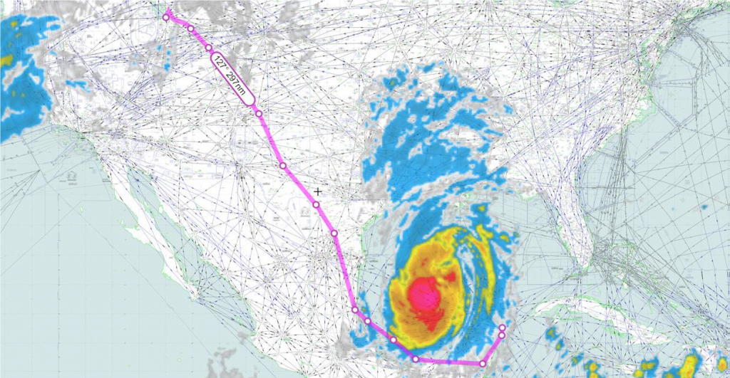 Los beneficios de planificar con anticipación realmente salieron a la luz cuando el huracán Delta azotó la región en octubre. El mecanismo de notificación automática activó el protocolo de rutas PASA y en 30 minutos, el ANSP afectado aprobó la solicitud de ruta de la aerolínea. A la aerolínea afectada se le emitió una ruta de contingencia como la que se ilustra a continuación, permitiendo que el vuelo evitara el huracán utilizando una ruta segura y viable de destino, lo que ahorro tiempo y dinero, mientras que los ANSP reciben notificaciones anticipadas del cambio en su demanda de sobrevuelo.