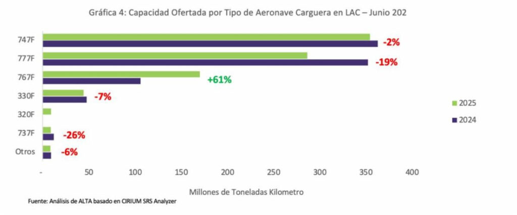 En junio, la capacidad operada en aeronaves cargueras hacia y desde LAC se mantuvo prácticamente estable, con poco más de 880 millones de toneladas-kilómetro (–0,9% interanual). El 40% se operó en B747F, mientras que el B767F registró el mayor aumento interanual (+61%).