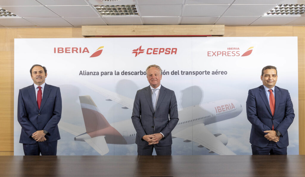 Los presidentes de Iberia e Iberia Express y el consejero delegado de Cepsa han firmado hoy un acuerdo para avanzar en la descarbonización del sector aéreo, a través del desarrollo e investigación de combustibles de origen sostenible y otras alternativas energéticas como el hidrógeno renovable y la electricidad, para fomentar la movilidad sostenible de aviones y de la flota de vehículos que les prestan servicios en aeropuertos.