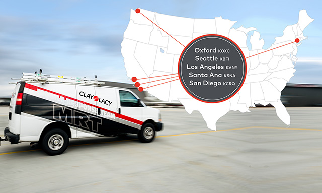 Clay Lacy ofrece una gama cada vez mayor de servicios de mantenimiento, inspección, reparación y AOG móviles de aviones comerciales en el aeropuerto Van Nuys, el aeropuerto John Wayne en el condado de Orange, el aeropuerto McClellan-Palomar cerca de San Diego, el Boeing Field de Seattle y el aeropuerto Waterbury-Oxford en Oxford, Connecticut. Clay Lacy es un distribuidor autorizado de las principales soluciones de conectividad de cabina y aviónica. Otros servicios incluyen renovaciones completas de interiores.