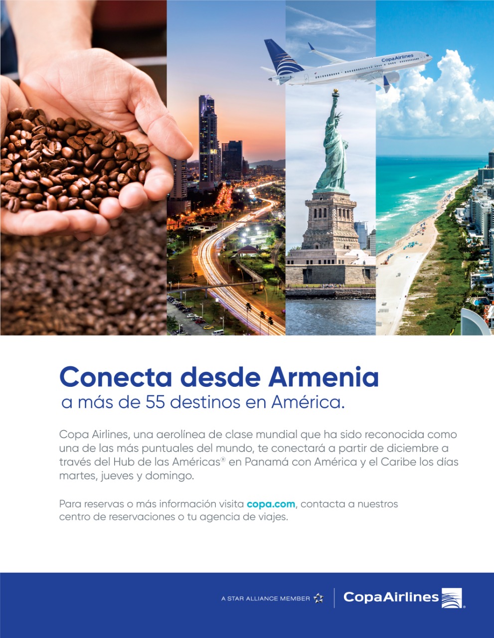 Además, los quindianos podrán disfrutar de la mejor conectividad desde su ciudad, con menos tiempo de llegada a su destino final, con conexiones rápidas de 50 minutos promedio a través del Hub de las Américas en Panamá, su equipaje es registrado directamente hasta su destino final y sin tener que pasar inmigración y aduana durante la conexión. El Hub de las Américas de Copa Airlines en Panamá es el punto de conexión aérea más eficaz y conveniente de la región, lo que le permite a Copa Airlines tener la mejor oferta de conectividad internacional para las ciudades de Colombia, y ahora para Armenia.