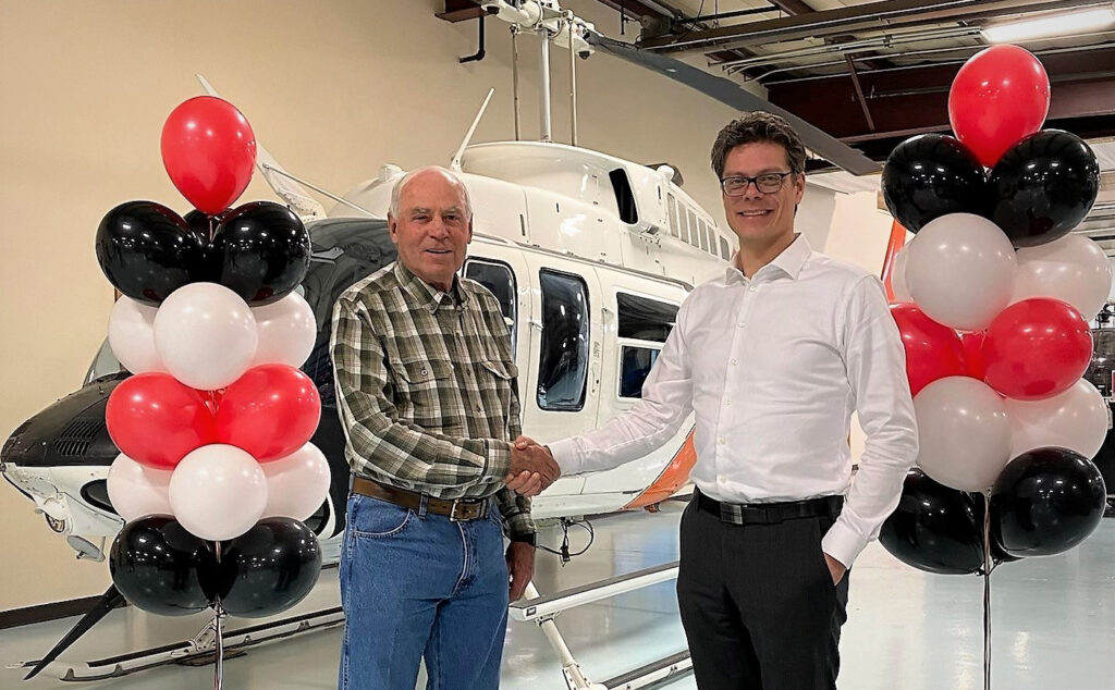 Larry Hansen (izquierda, Paravaion Technology Inc y Century Helicopters Inc) con Alain Madore (derecha. Presidente y CEO DART Aerospace)