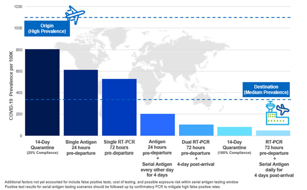 El modelo y análisis de Boeing muestra que los protocolos de detección ofrecen una alternativa a las cuarentenas obligatorias en muchos escenarios de viaje. El modelo evalúa la efectividad de los exámenes de detección y cuarentena de pasajeros en países de todo el mundo. Tiene en cuenta varios factores, como la tasa de prevalencia del COVID-19 entre los países de origen y destino, la eficacia de la PCR y las pruebas rápidas de antígenos, y el cronograma de la enfermedad (progreso de la enfermedad) para los pasajeros que viajan con COVID-19.