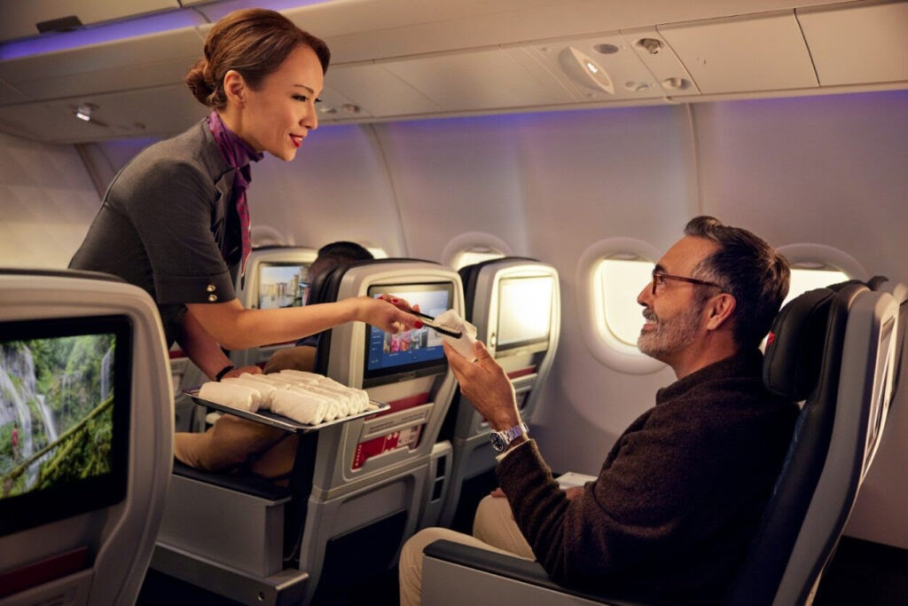 Durante el vuelo, los clientes disfrutarán de un servicio de toallas calientes seguido de una experiencia gastronómica de primer nivel con platos principales servidos en platos con vajilla y servilletas de lino, cubiertos de plata y cristalería. Se ofrecerá una canasta de refrigerios premium durante todo el vuelo y los chocolates servidos antes de la llegada brindarán una cálida despedida.
