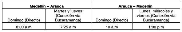 La ruta Medellín – Arauca – Medellín, será operada de forma directa, todos los domingos y, de lunes a viernes, en conexión vía el aeropuerto Palonegro que sirve a la ciudad de Bucaramanga, en aviones ATR42 con capacidad para 48 pasajeros.