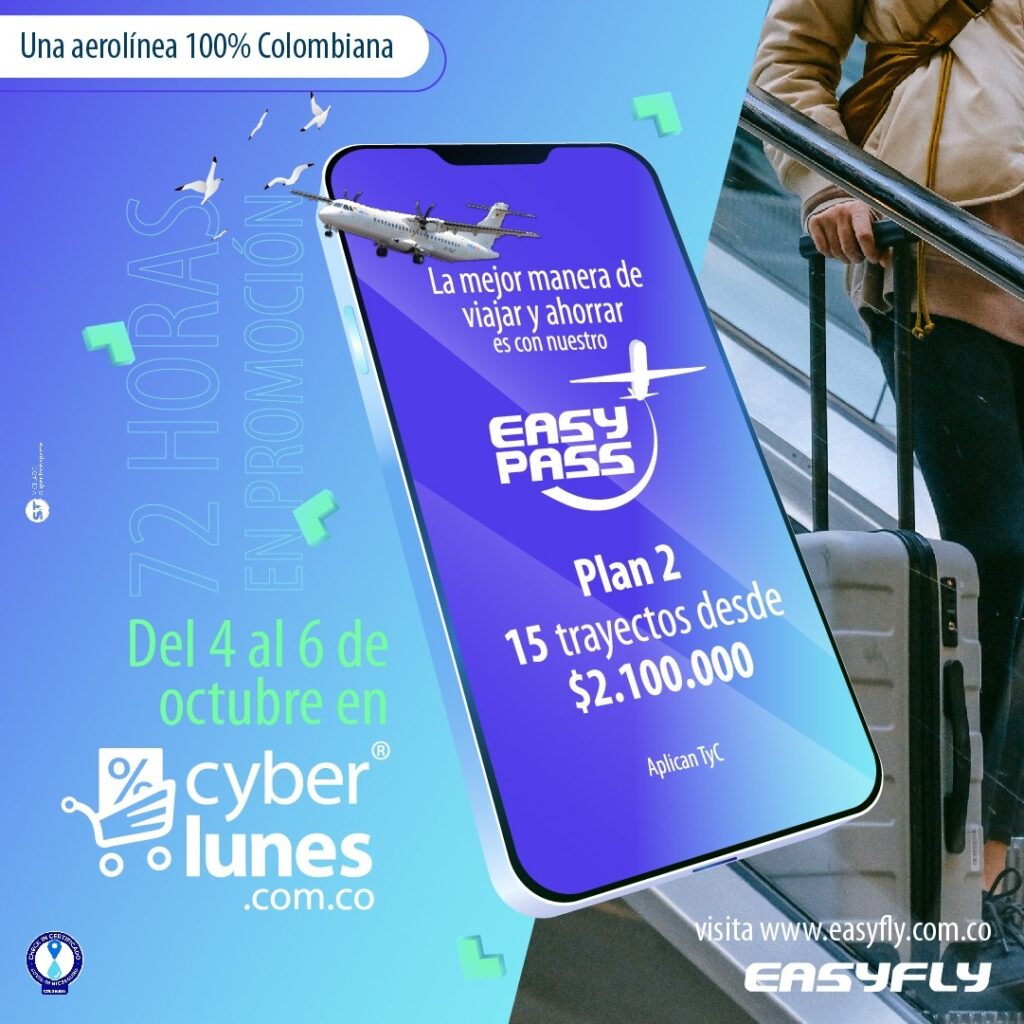 Del 4 al 6 de octubre, Easyfly, se suma nuevamente a Cyberlunes, con el mejor paquete para viajar entre destinos nacionales con Easypass: una alternativa llena de beneficios para los viajeros que tienen en la aerolínea, la mejor opción para volar de punto a punto, sin escalas, de manera eficiente y mucho más económica.