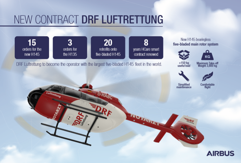 Airbus Helicopters y DRF Luftrettung han firmado un contrato para la compra de 15 nuevos H145, tres H135 y la actualización de sus 20 H145 actuales a la versión de cinco palas. Esto llevará la flota H145 de los Servicios Médicos de Emergencia de Helicópteros Alemanes (HEMS) a 35 helicópteros, lo que los convierte en el mayor operador del H145 de cinco palas del mundo. El contrato, reservado en 2019, también renueva el contrato inteligente HCare de DRF, un contrato de soporte completo por hora para toda la flota de DRF durante los próximos ocho años.