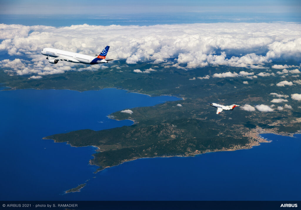 En abril, el A350 realizó tres vuelos sobre el mar Mediterráneo seguido por un avión Falcon de DLR para comparar las emisiones en vuelo tanto del queroseno como del combustible sostenible de ésteres y ácidos grasos hidroprocesados (HEFA) de Neste. El equipo también llevó a cabo pruebas de conformidad utilizando un 100% de HEFA y no se experimentaron problemas de funcionamiento.