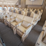 La cabina de la Clase Business del Boeing 777 de Emirates también ha sido rediseñada, con asientos dispuestos en una configuración individual para ofrecer privacidad, acceso total al pasillo y amplio espacio para trabajar, relajarse y descansar. Cada asiento está tapizado en cuero champán, a juego con los del último A380 de Emirates, con costuras detalladas y reposacabezas suaves y acolchados.