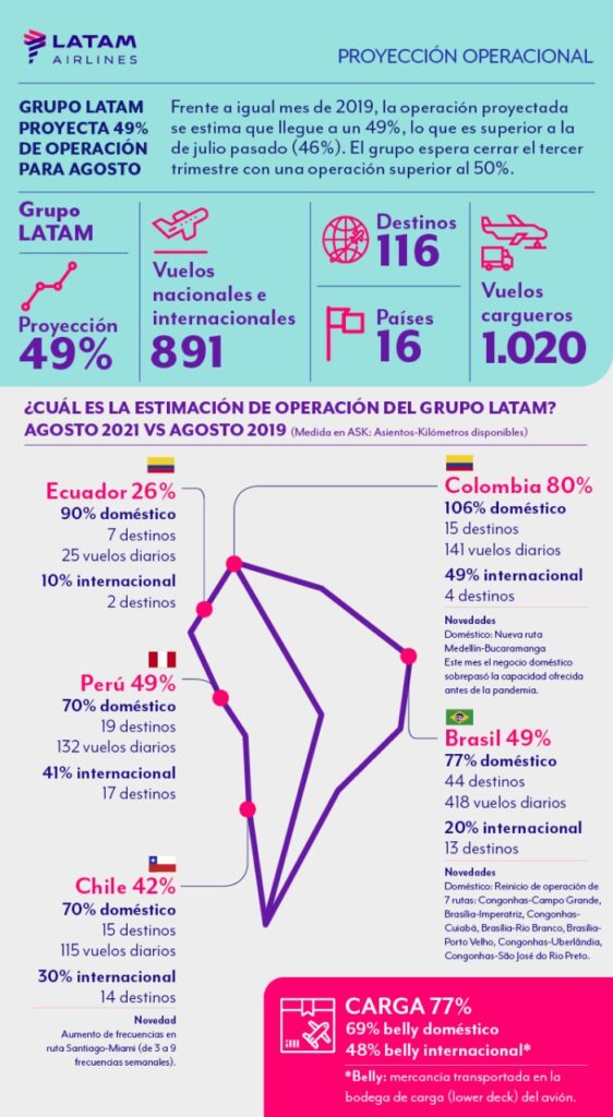 LATAM prevé aproximadamente 891 vuelos diarios nacionales e internacionales durante agosto, conectando 116 destinos en 16 países. En tanto, el negocio de Carga tiene programados durante el periodo 1.020 vuelos en aviones cargueros, un 19% más que en el mismo mes de 2019. Todas estas proyecciones están sujetas a la evolución de la pandemia así como a las restricciones de viaje en los países donde opera LATAM.