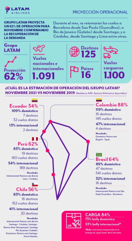 LATAM prevé operar aproximadamente 1.091 vuelos diarios nacionales e internacionales durante noviembre, conectando 125 destinos en 16 países. El negocio de carga tiene programados 1.100 vuelos en aviones cargueros con un nivel de utilización un 19% mayor en promedio que el mismo periodo de 2019. Todas estas proyecciones están sujetas a la evolución de la pandemia así como a las restricciones de viaje en los países donde opera LATAM.