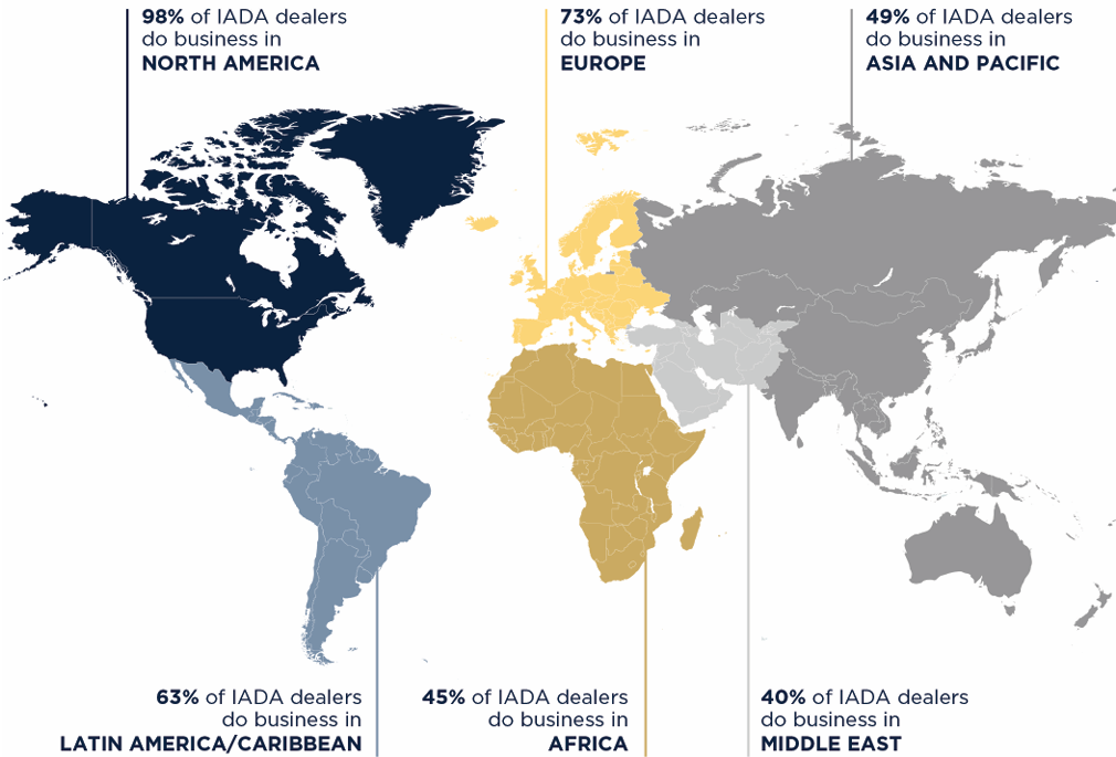 Como parte de su misión de expandir su presencia global más allá de Norteamérica, IADA ahora opera en más de 100 países en todo el mundo. La asociación continúa dando forma a la industria de reventa de aeronaves de negocios a través de su compromiso con la confianza y la transparencia. En la actualidad, el 73% de los distribuidores de IADA realizan negocios en Europa, el 49% en Asia y el Pacífico, el 45% en África y el 40% en Oriente Medio.