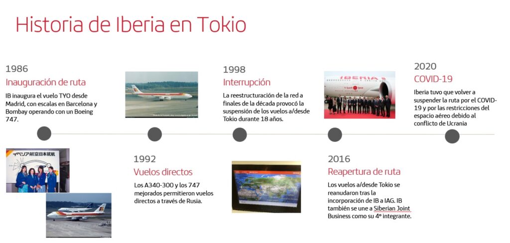 El vuelo a Tokio, además de sumar un nuevo destino al mapa de rutas de Iberia, supone también la vuelta de Iberia a Japón y a Asia. La primera vez que la aerolínea española voló a Tokio fue en 1986. A diferencia de los vuelos directos que se ofrecerán el año que viene, en eso momento, el plan de vuelo incluía dos paradas, una en Barcelona y otra en Mumbai. En 1992 con la incorporación a la flota de Iberia de los Airbus A340 y la versión mejorada de los Boeing B747, la compañía operó vuelos directos entre ambas capitales hasta 1998. En 2016, Iberia volvió a ofrecer esta ruta a sus clientes hasta 2020, cuando irrumpió la pandemia del COVID-19.
