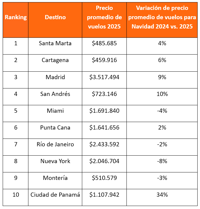 “Aunque los viajes internacionales tienen valores superiores a los nacionales, esta temporada abre ventanas de oportunidad: rutas como Cancún y Fort Lauderdale muestran precios promedios de vuelos con reducciones del 12% y 15% respectivamente frente a 2024”, complementa Alejandro Lombana.