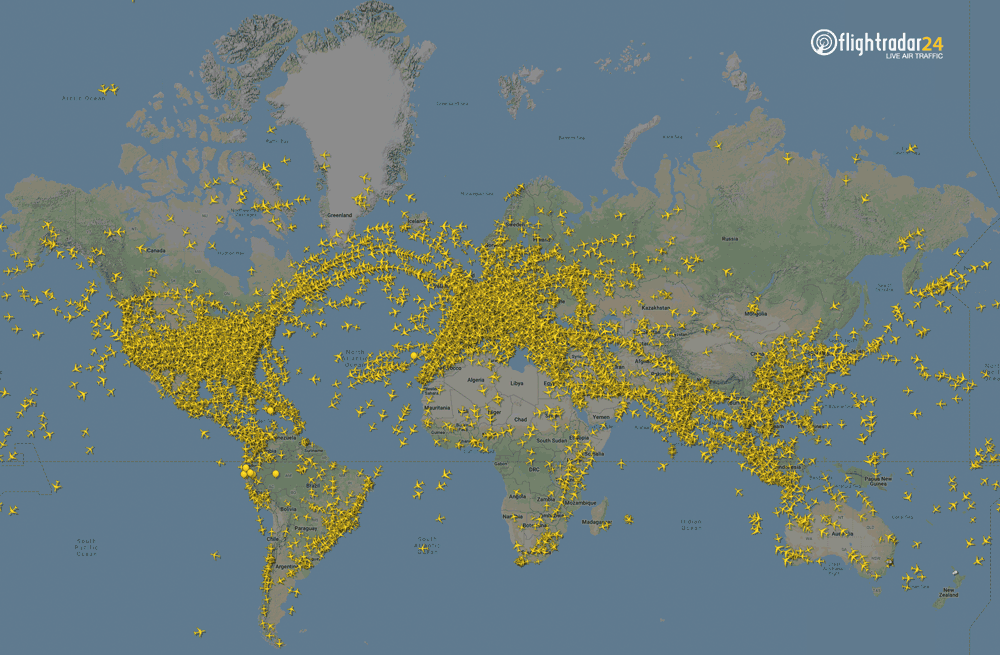 Flightradar24 realizó una breve animación que muestra vueltos alrededor del mundo a inicios de marzo, hacia las 15:00 horas UTC.