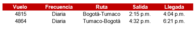 Itinerario nuevo vuelo Tumaco-Bogotá: