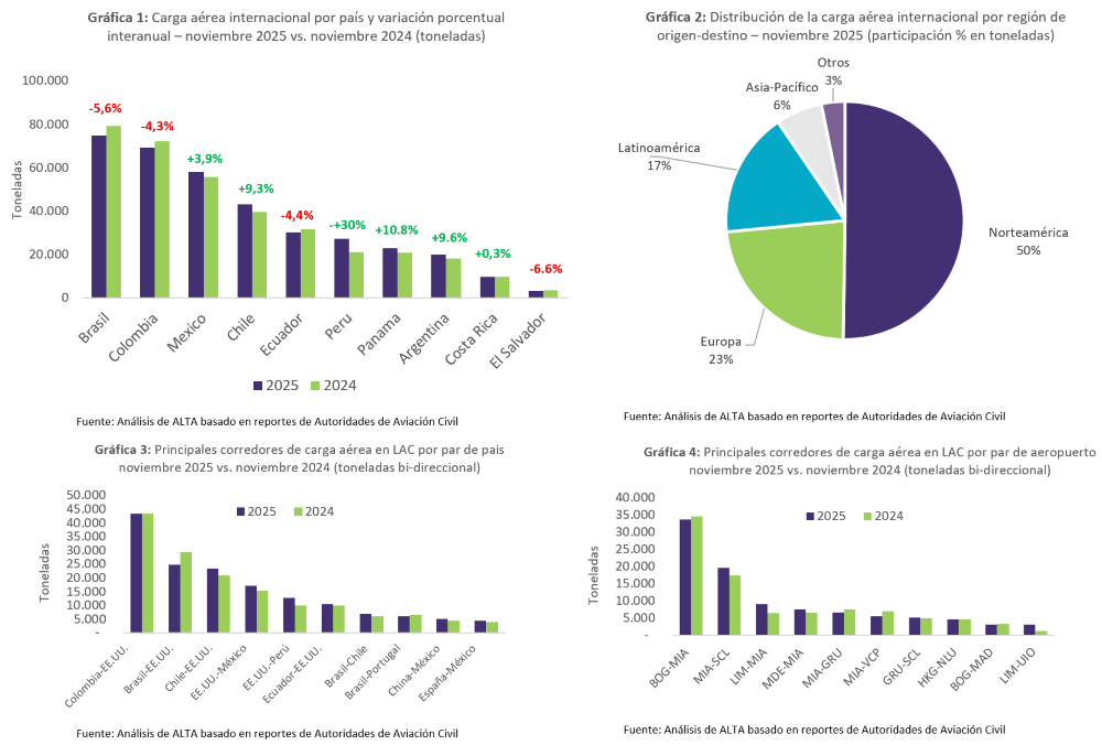 “Noviembre mostró un repunte en la carga internacional, aunque con un desempeño muy distinto entre países. Los mercados que crecieron —como Perú, Chile, México y Panamá— lo hicieron impulsados por mayores volúmenes desde y hacia Estados Unidos, con China aportando crecimiento adicional en los flujos de Chile y México. En contraste, Brasil y Colombia registraron caídas debido a retrocesos en su dinámica comercial con Estados Unidos. Esto confirma el peso determinante de los principales socios comerciales en la dinámica de carga de la región”, afirmó Peter Cerdá, CEO de ALTA.