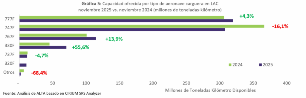 En noviembre, la capacidad operada en aeronaves cargueras hacia y desde LAC registró una leve contracción interanual de 0,2%, totalizando 837 millones de toneladas-kilómetro, tras el sólido avance observado en octubre (+10,4%). El B777F, que representó el 38% de la capacidad total, registró un crecimiento de 4,3%, acumulando dos meses consecutivos de expansión. El B747 pasó a ocupar el segundo lugar en importancia, con una participación del 37%, aunque con una caída interanual de 16,1%, la más pronunciada del año. Por su parte, el A330F lideró el crecimiento interanual con un aumento de 55,6%, mientras que el B767F mostró un alza de 13,9% (gráfica 5).