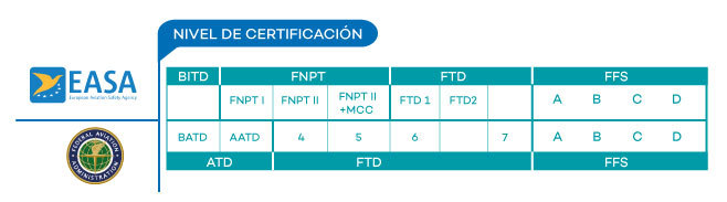 Estas serían las categorías de certificación para EASA y FAA y sus equivalencias, de menor a mayor fidelidad respecto a la aeronave simulada: