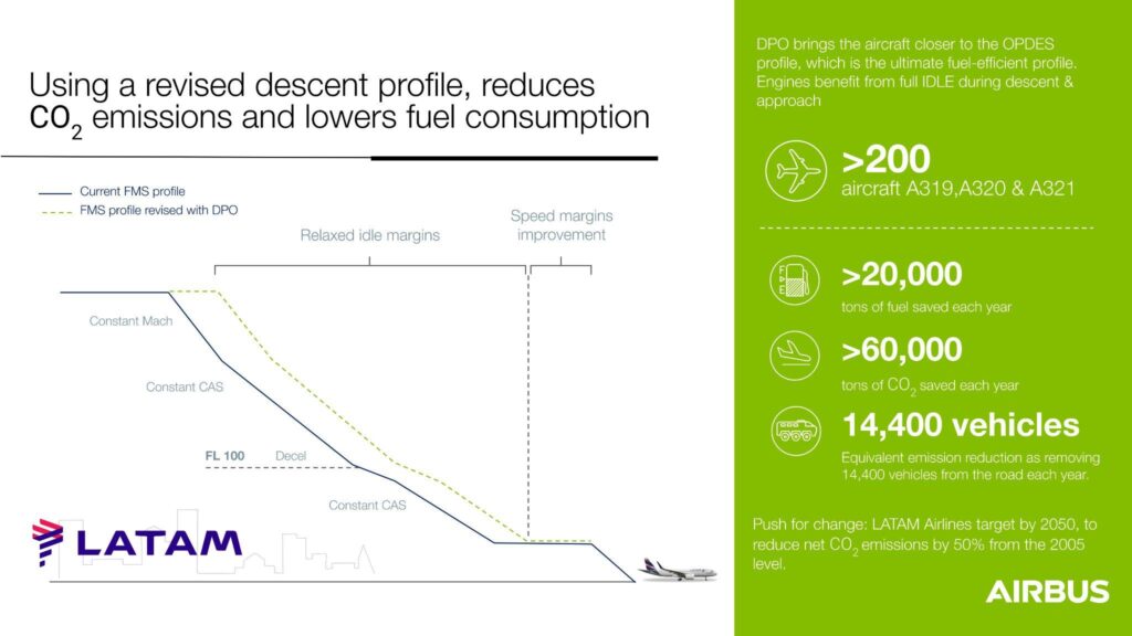 LATAM Airlines va a actualizar su flota de la Familia A320 con la función “Descent Profile Optimisation” (DPO) de Airbus, una mejora de ahorro de combustible en la base de datos de rendimiento del Sistema de Gestión de Vuelo (FMS) de a bordo del avión. Esta mejora se realizará en más de 200 aviones de su flota de la familia A320, convirtiéndose en la mayor flota de Airbus equipada con esta potente solución de ahorro de combustible.